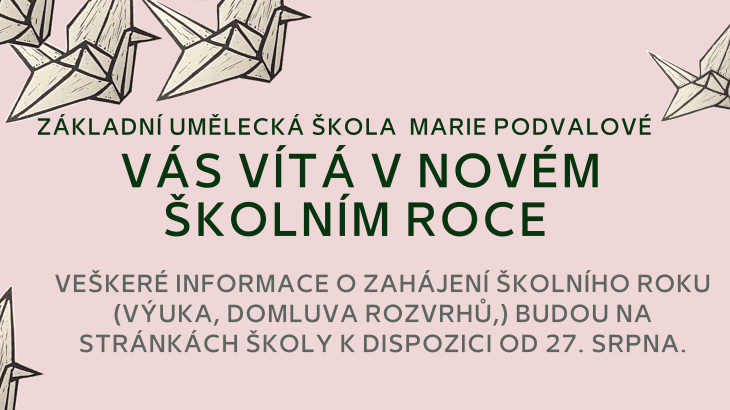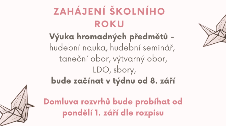 Informace o zahájení školního roku 2025 – 2026 Školní rok zahajujeme 1. září od 13. 00. do 17. 00 V té době probíhá domluva rozvrhu s většinou učitelů nástrojů a zpěvu a zápis do všech oborů a některých volitelných předmětů, které nebyly zapisovány přes internet. 28. 8 bude zveřejněn seznam všech učitelů a detailní doba a […]